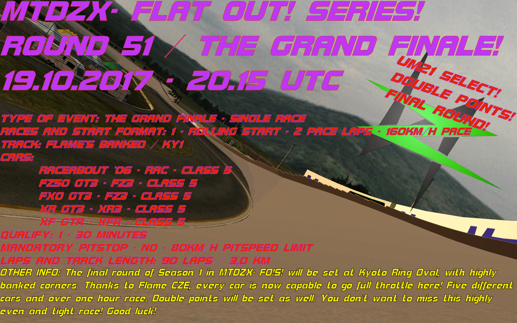 Willi a.k.a. The champ confirmed his victory of Season 1 by finishing the last round in 3rd position. He was not required to be fastest man at track despite he even set fastest lap at race. All he need to do, was to keep UM21 behind. So he did as UM21's RAC car had unexpected suspension damage, forcing him to pit and was eventually finished on 6th place. That means Willi wins Season 1 by 612 points, 8 more than UM21. More detailed info about it and generally flat out! series! season 1 will be given later at some point!