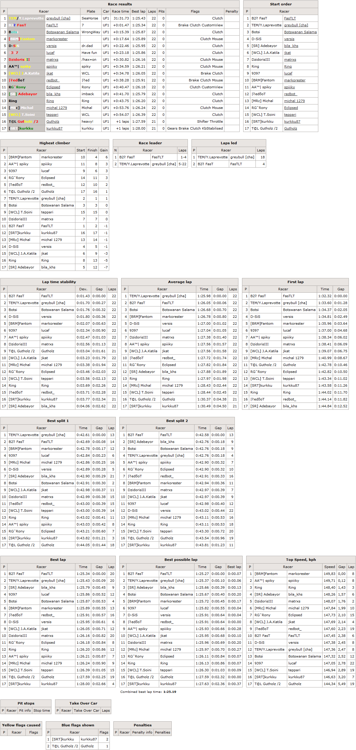 Anyway - up ahead there were no incidents,just head to head racing with Y.Laprevotte once again being fastest in race while starting from 2nd position - it was his 14th win in RTFR,just one less then all time most. Even if it was shared,still fastest lap counts towards stats and it was Y.Laprevotte's 7th,also it was his 30th top5 finish,getting close to Falcon's 2nd position in this chart (32),3rd most currently. Storm had the fastest lap in both sessions (both are his first),while 2nd place was his best finishing position in RTFR,improving by 1 position,6th top5 finishes in his account now. 2nd appearance of Expr ended with "just" 3rd position,2nd top5 finish for previous winner,4th was 1st time participant Texas,5th was Nick,who upgraded his previous best position 9th pretty rappidly in his 11th finish in RTFR.