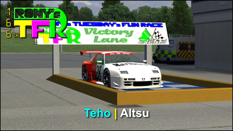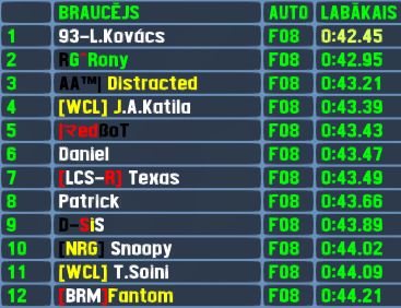After having the post double as long as normal ones,we finally come to the results part - there were no doubts about potential winner yesterday,as he was a level faster than anyone else,since no possible opponents joined the event,Altsu had to take a relatively easy victory,taking also the pole position and fastest lap of the race - all of them are the 2nd ones for the finnish racer,who also picked up his 3rd top5 finish. Best of the rest was another finn - UM21 gained 5 positions during the race and finished 2nd which is his 11th top5 finish,Dzidoris used a backmarker for pass bringing him 3rd position in finish,7 top5 finishes now are in his account. Adebayor finished 4th improving his previous best finish by 1 position in his 2nd visit in top5,while Rony completed the top5 with his 65th entry there.