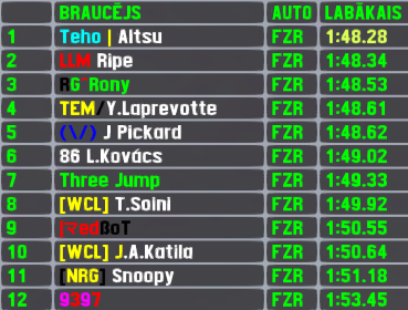 It was the 2nd race using FZR and at least in one statistic it was better than previous - finishing rate. 14 drivers started and 12 of them reached at least half of the distance to be counted finished. Also we have 8th different winner in last 8 races - seems like noone can repeat their success here,even with being able to pick next combo,let's see if the trend continues and with it the growth of RTFR XL Winners Club.