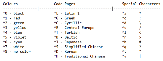 A caret/circumflex in front of certain upper case letters will change the Code Page (language lookup).