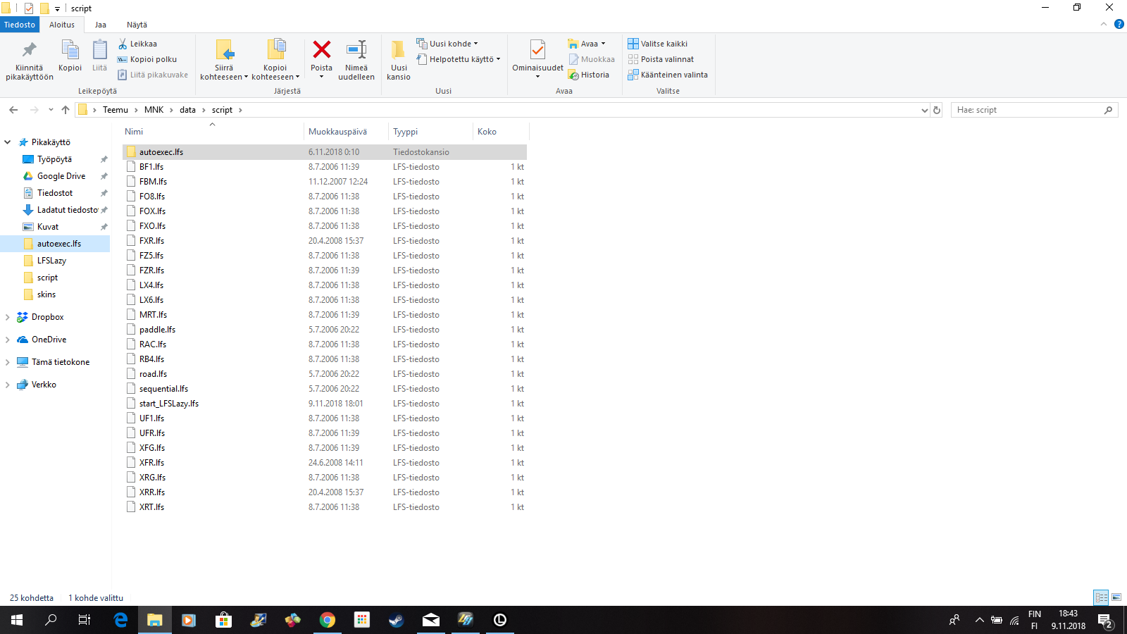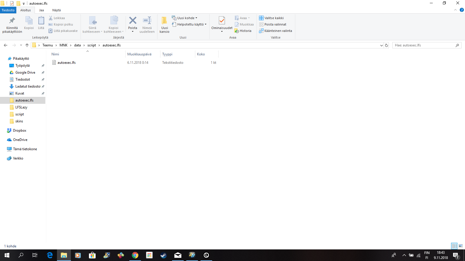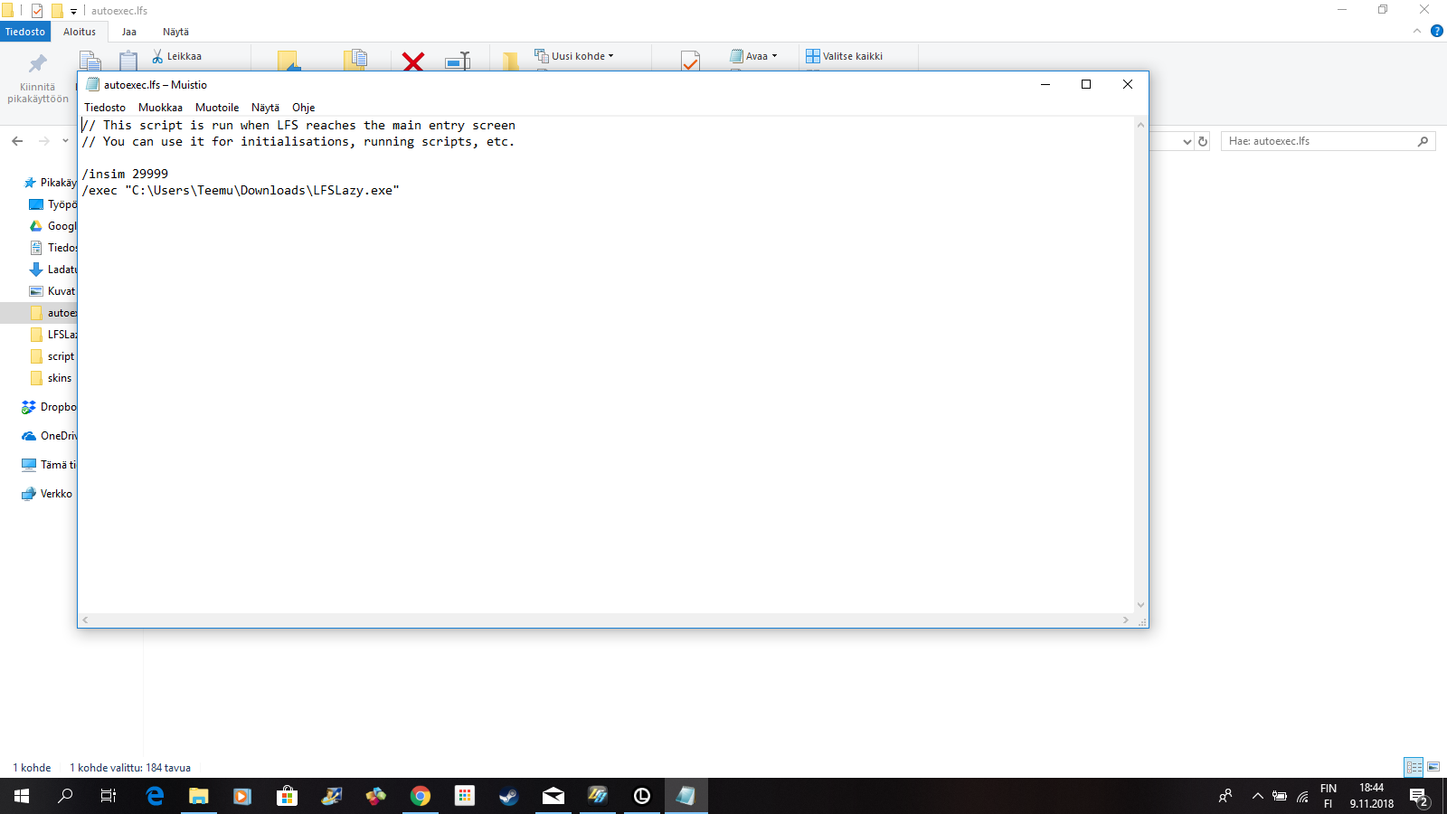 Go to C:\Users\Teemu\MNK\data\script and make new one. Copy, paste, rename existing one to autoexec.lfs, then open it with notepad and clear content, if there is any.