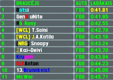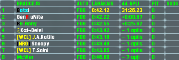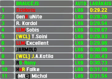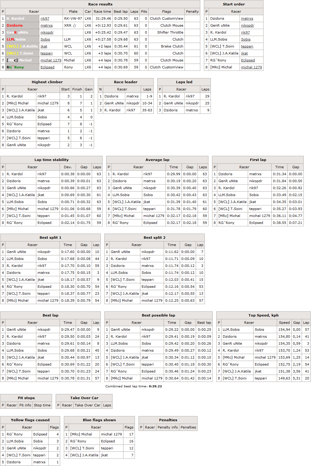 13.Brunnkvist - receives a WARNING for overly agressive behaviour in 1st lap,causing multiple contacts between each other and other drivers. Similar behaviour in future will lead to race ban. The race is 30 minutes long and it cannot be won in 1st lap,only lost,this is not a rallycross race,where you get your position in 1st turn agressive move and hold it for remaining 3 laps! If you have no intention to race full distance,then please don't even start,it's just disrespectful to other drivers,who lose track position and even gain damage to their cars due your agressive driving.