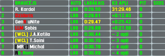 13.Brunnkvist - receives a WARNING for overly agressive behaviour in 1st lap,causing multiple contacts between each other and other drivers. Similar behaviour in future will lead to race ban. The race is 30 minutes long and it cannot be won in 1st lap,only lost,this is not a rallycross race,where you get your position in 1st turn agressive move and hold it for remaining 3 laps! If you have no intention to race full distance,then please don't even start,it's just disrespectful to other drivers,who lose track position and even gain damage to their cars due your agressive driving.