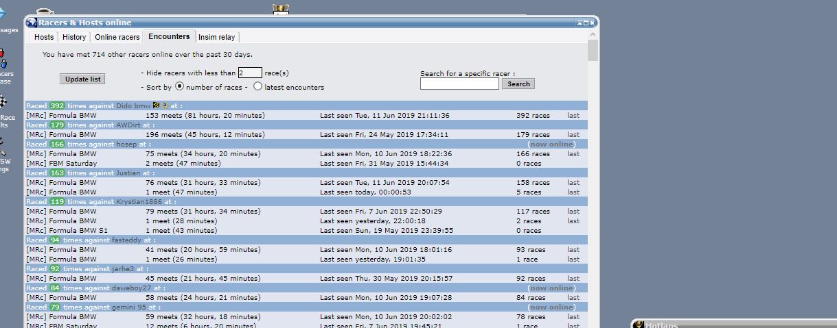 Quote from bishtop :You can find your encounters info(racers met) from LFSWORLD which enables you to see who and how many times you encounter someone online with a couple of filters.
