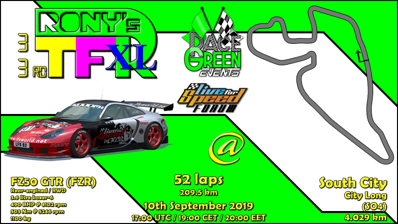 The october RTFR XL race in 4 weeks will bring back currently the most popular car of this event - FXO. In 2 occasions FXO has average attendance of 23 drivers per race and also has the event record of 32 drivers. The venue - Westhill's longer configuration named International,race lenght will be calculated to 34 laps. But already next week the normal RTFR will return with street legal car action,more details in the weekend.