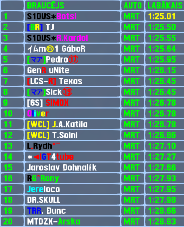 The best at this discipline was Botsi,who already in qualifying proved to be fastest by a good gap than competition. He did lose the lead in lap one however,but his opponent could not keep him behind for long and Botsi led more than 4/5 of the race to score his 5th RTFR XL race win,combined with 5th pole position and 5th fastest lap of the race - he was a tied leader in all these charts until yesterday,it was also Botsi's 7th top5 finish. Spiky was the one,who was able to challenge Botsi - he passed the finn entering turn 1 and kept himself in leading position for 6 laps until conceding to Botsi's pass in the very same turn. In the finish it was 2nd place for the previous 2-time winner and 5th top5 finish. R.Kardol joined just before race was about to start and rallied through the field to find himself in 3rd position while crossing the finish line - he made podium to consist only from previous winners (no other previous winnere were present at this race) and earned his 9th top5 finish. The son of not racing previous winner J.Katila finished 4th,with this he repeated his only previous top5 finish while his countryman Finmaxi scored his 2nd top5 finish by finishing 5th yesterday.