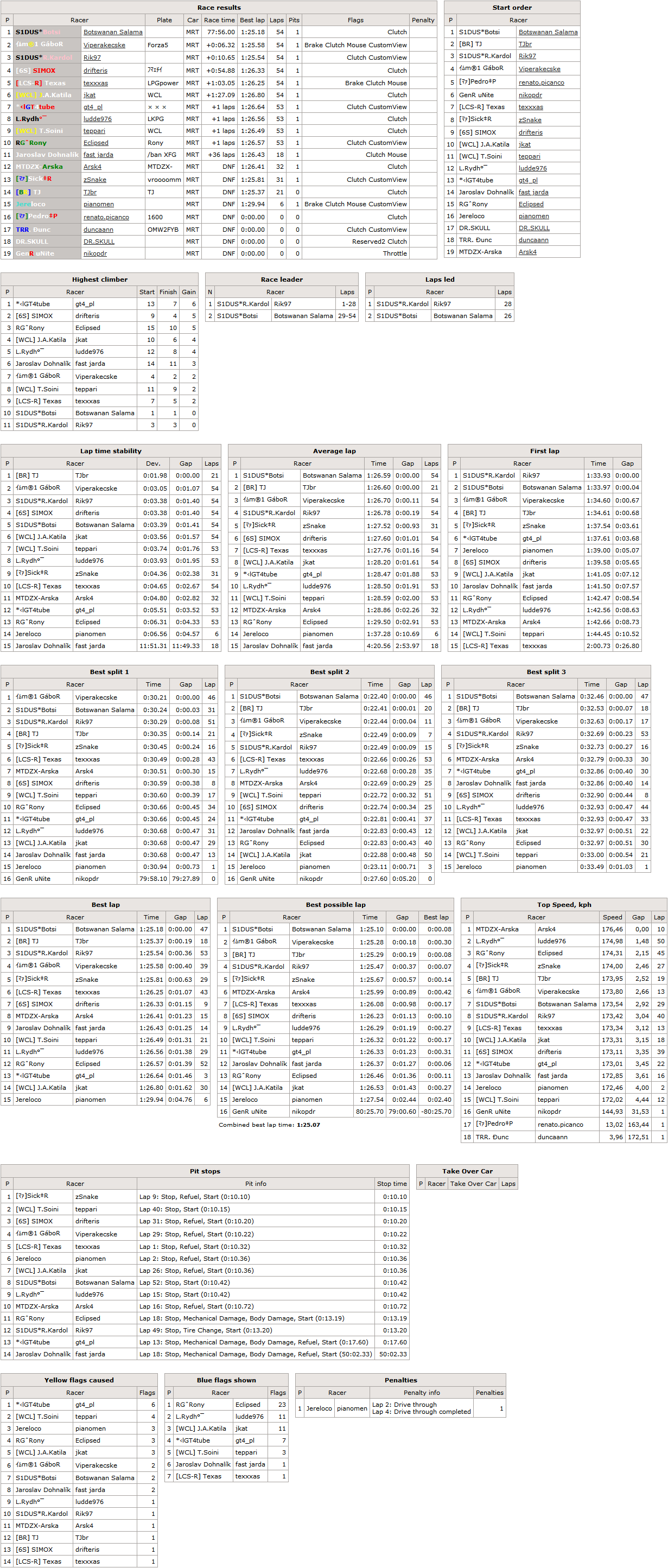 Defending race winner Litti used his picked combo for advantage and practically dominated the race even if it does not look like that on stats sheet. He was fastest in qualifying by a quarter second and led the field off the grid,but got involved into incident when entering infield track which caused him to drop down in order. But he recovered quickly,regained the lost positions and regained the lead when his main rival pitted for the first time. Another positions switch was made in next pitstop sequence and Litti regained lead with 23 laps to go to lead the remaining race on way for his 2nd successive race win. Just like in previous race Litti took the full sweep of race win,pole position and fastest lap. Botsi led just over 1/2 of race distance,but had to concede to his faster countryman by 11 seconds,5th top5 finish for the most successful driver in both RTFR events. Simox was the only other driver,who was up front in race lead,but he never crossed the finish line as a leader,so no entry in these stats for him,it was 2nd race for him in this event and he repeated previous result by finishing 3rd,he was also the only non-finn in top5. J.Katila made a debuth in XL event with 4th place finish,he gained a position upon Unite's speeding penalty while entering pitlane on last lap - Unite is now 5th in final results,4th top5 finish for him.