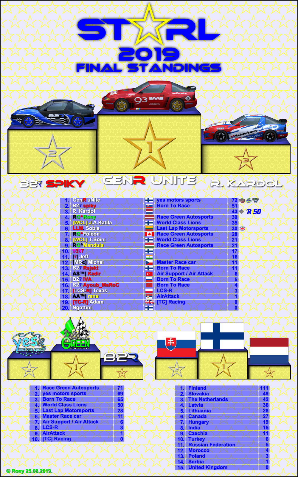 It's been a while since the hosting team was able to clinch teams title in it's own organized series (last title was AWS 2016),in the inaugural season of STARL 3 of it's members took part and all of them scored valuable points towards title,scoring a total of 5 top5 finishes. The single driver team of Unite - yes motors sports - took 2nd place in teams standings,as the sole performance of the champion was not enough to beat team effort. The 3rd team in the table is Born To Race and it was represented by a total of 4 drivers,but only one of them attended in more than 2 rounds,while none of them in final round,giving up the chance to challenge RGE for teams title.