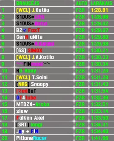 After recent success in normal RTFR,Litti made a debuth also in XL version and that with style - he set a lap more than a second faster than the competition in both sessions and was never challenged for win as he led every meter of the 180 kilometer race. After 16 races break the 6th most successful driver of RTFR XL made a return to the event under new name and flag. Merenui carried over his qualifying position to finish line and added 2nd place finish to his 2 race wins to make a total of 4 top5 finishes. Another finnish first time participant M.Wentjärvi finished 3rd. Only other previous winner R.Kardol finished 4th,which is his 8th top5 finish (tied 3rd most),Riddick started from back of the grid and still joined the top5 finishers list for the 2nd time.