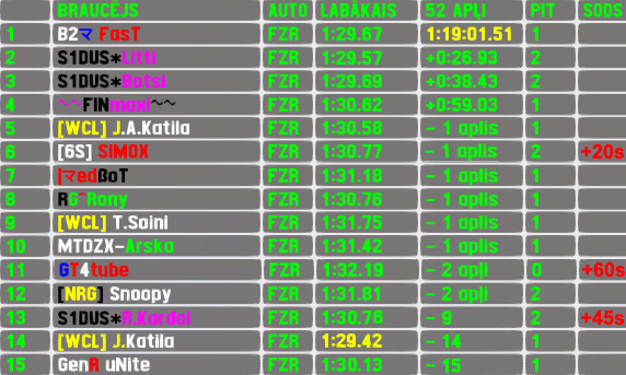 After recent success in normal RTFR,Litti made a debuth also in XL version and that with style - he set a lap more than a second faster than the competition in both sessions and was never challenged for win as he led every meter of the 180 kilometer race. After 16 races break the 6th most successful driver of RTFR XL made a return to the event under new name and flag. Merenui carried over his qualifying position to finish line and added 2nd place finish to his 2 race wins to make a total of 4 top5 finishes. Another finnish first time participant M.Wentjärvi finished 3rd. Only other previous winner R.Kardol finished 4th,which is his 8th top5 finish (tied 3rd most),Riddick started from back of the grid and still joined the top5 finishers list for the 2nd time.