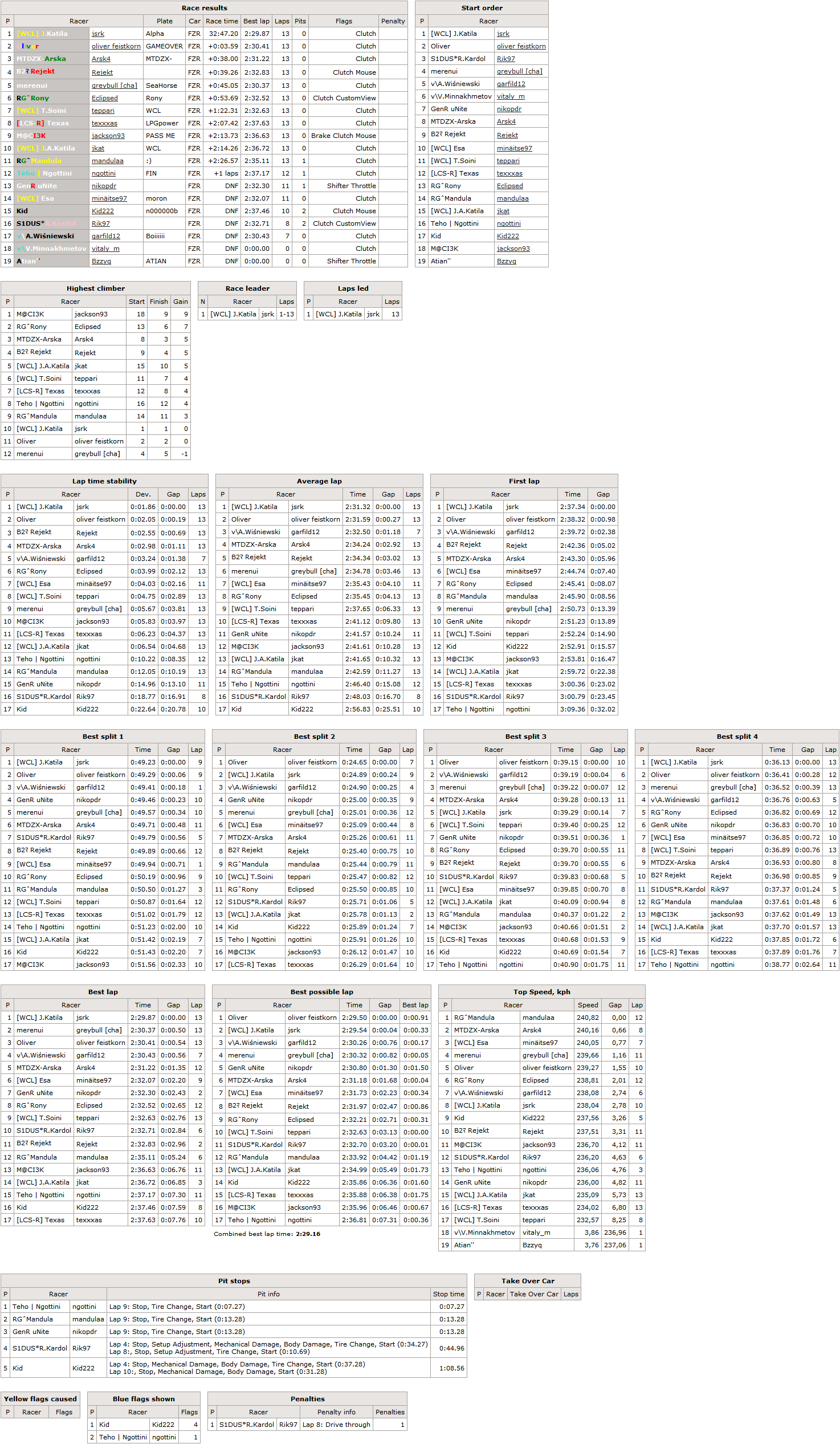 The 4-time winner Litti (while using a VR device?) started the race from 3rd grid position and after 1st chicane used the fight between both front row starters for his advantage and outbraked both in the 1st actual turn - he never gave up the lead for remaining 76 kilometers of race distance and joined a bit more exclusive 5-time winners club. While running away from competition,he also set the fastest lap of the race - his 7th,while he also finished in top5 for the 7th time. Botsi was the 2nd fastest in qualifying and kept this position also after early position switchings,but his chase for lead never succeded - 2nd place finish,which is 38th top5 entry for him. Maddee set the fastest lap in qualifying and scored his 2nd pole position,unlike last time he did that,this time he tried to convert in into win - he started an RTFR race for 2nd time and completed one for the first time with 3rd place finish. Ironically the driver who broke finnish winning streak was the fastest non-finnish driver also yesterday - R.Kardol was best of the rest and finished 4th,scoring his 21st top5 finish,while first time participant GT4tube closed the top5.