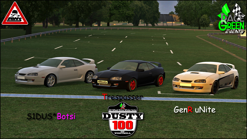 This Dusty 100 was quite different from the one last year - probably mostly because of better preperation as drivers knew what to expect. Better pace,less position changes - last year only 4 cars finished on lead lap,this year - 7,while in qualifying 3 drivers set a laptime better than last year's pole position time. Still - a total of 400 left turns never gave a chance to relax and only first 2 of those weren't led by Trespasser. The "oval junkie" from other series joined AWS action this sunday and proved his skills in this specific track type,even if the surface was different - Trespasser started from outside of 1st row,cut to the inside when exiting turn 1 and grabbed the race lead in turn 2,which he never gave up despite late race pressure. The polesitter Unite had to chase hard,but left without success - he could not regain the early lost lead and finished 2nd. Winner of 1st round Botsi finished 3rd,chased by defending champion (in both round and series) Sobis,who finished 4th.