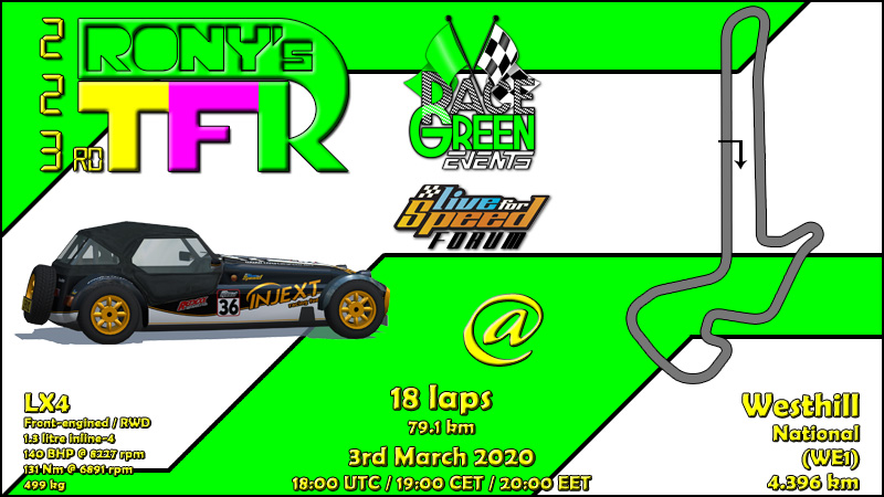 Let's hope server will rest well over the 2 weeks of break between this and next RTFR - then one of the slick tyre racing machines will return for action,more details as always here in this section in the weekend before it. RGE offers another piece of racing this week,but the participation is limited - in the final round of AWS only drivers already scored points towards standings will be allowed to participate. Others still have the chance to follow the action and title decision via LFSremote!