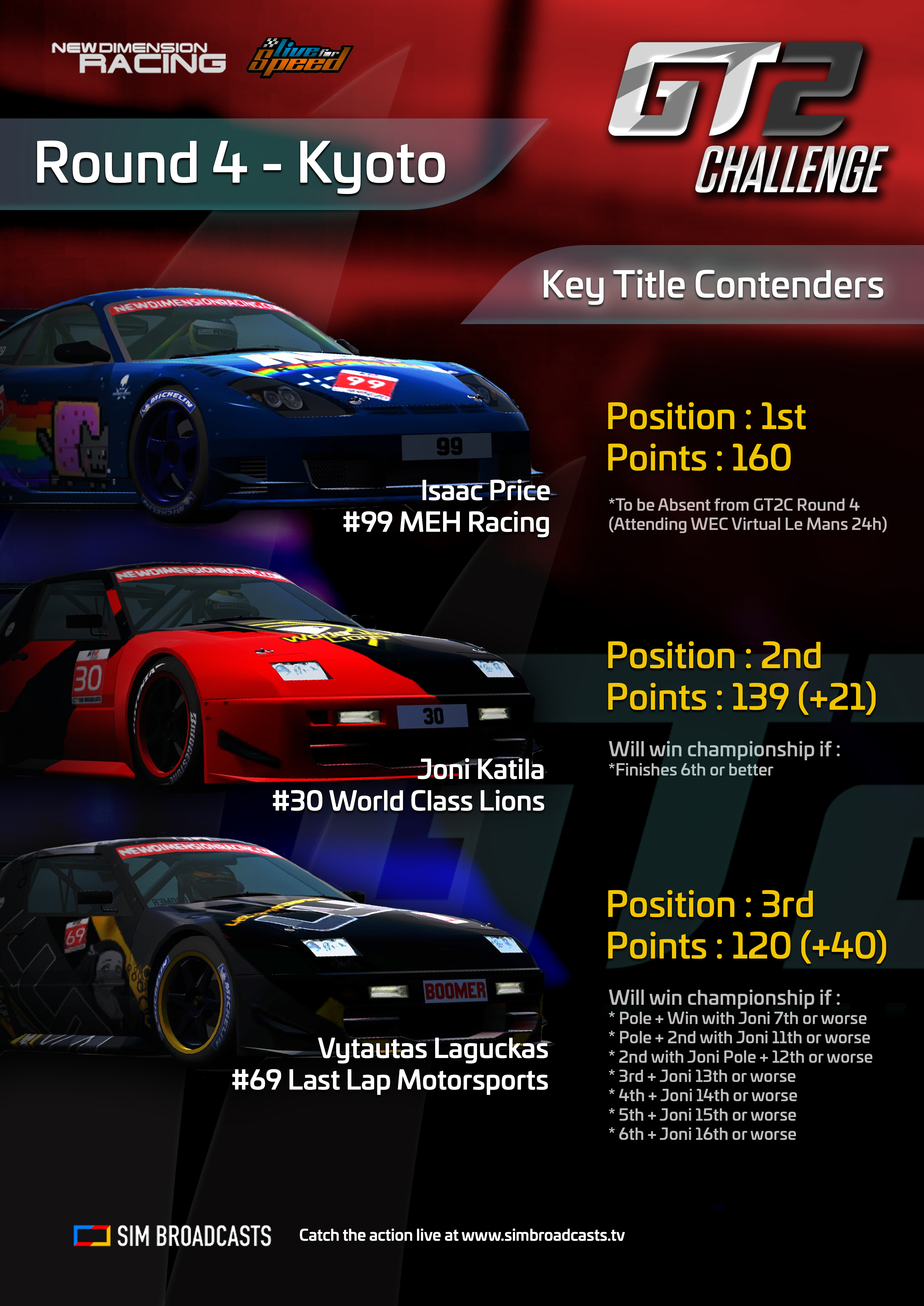It's the finale of the championship, and current P1 man Isaac Price will be off gallivanting with real racing drivers in rF2 with the WEC's Virtual Le Mans 24h. All these scenarios are assuming he indeed cannot race with us on Saturday.