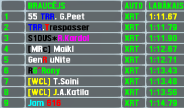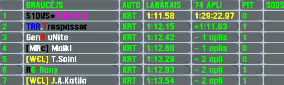 3rd different winner in 3 rounds deffinitelly makes the standings table more interesting - leader is still Rony and his advantage is still just a single point,just the follower has changed and even doubled in amount. T.Soini and Unite both have same points count,while the latter is in higher position due better 2nd best position. Rookie of the year standings leader hasn't changed despite him retiring and with point for pole position he even increased his lead over Snoopy,who did not attend this round and lost one attendance bonus point.