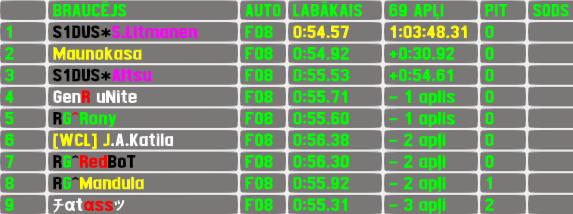 After not attending round 3,series leader S.Litmanen returned and performed another dominating raceday - he led every single meter of the race and scored all possible points once again. The all finnish podium featured 2 previous winners - the winner of this season's previous round Maunokasa finished 2nd hald a minute behind the winner,while the defending round winner Altsu finished 3rd,starting his final lap few seconds before winner's finish.