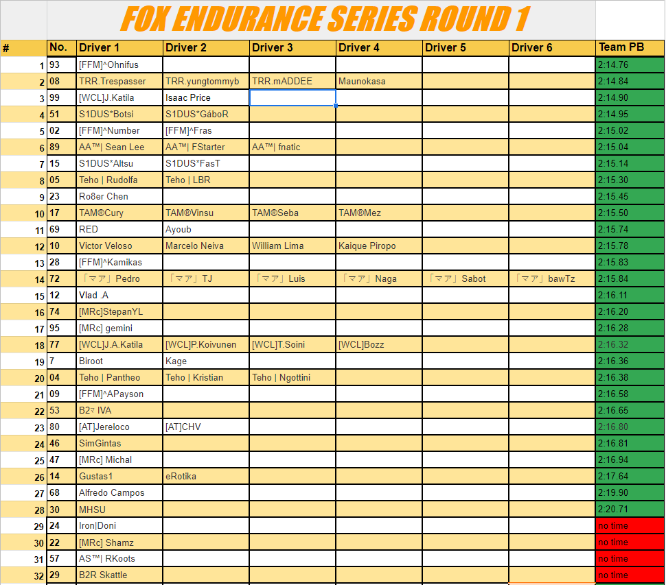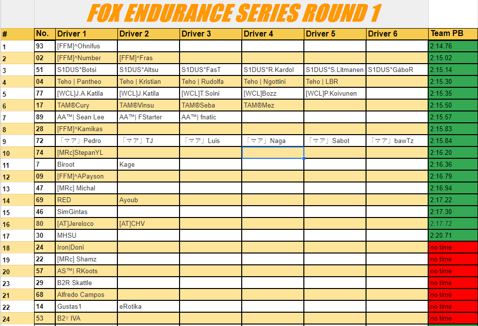 For every Round, there will be a prequalification. Entries for a round will be selected by compiling a table of fastest laps per driver on FM FOX Endurance server, with help of Airio and its !top list. Only lap times of signed up players will count. A table with entries will be published periodically. A prequalification period will end 2 days before Round start, on Thursdays at 20:00 CET. On Friday a list of entrants will be published with server password protected and password sent to all participants.
