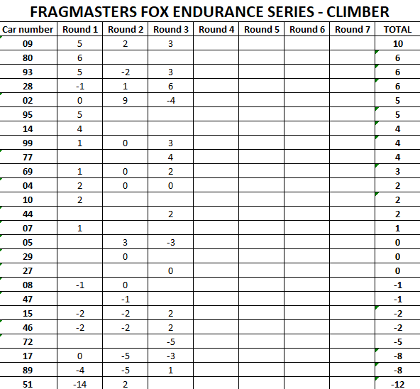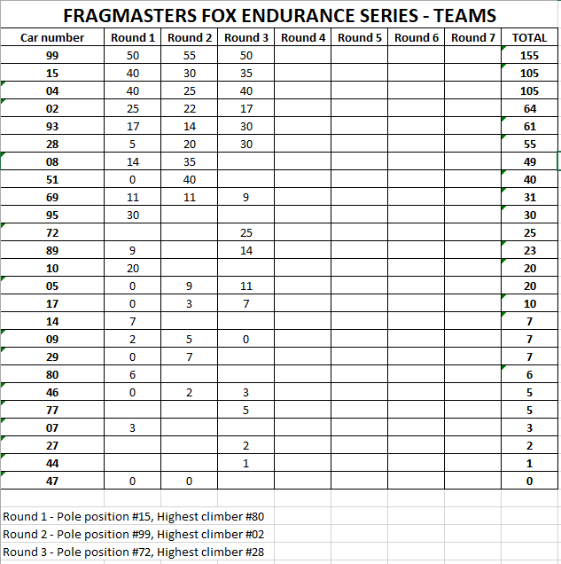 We will also track the highest climber statistic, based on number of places gained by a car from his starting point into the race to his finish point. This excludes qualify, so it is possible to take points for pole position and highest climber. The driver with highest number of accumulated highest climber stat will get a series end reward.