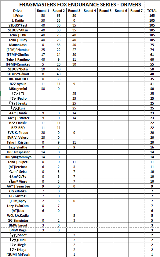 For every Round, there will be a prequalification. Entries for a round will be selected by compiling a table of fastest laps per driver on FM FOX Endurance server, with help of Airio and its !top list. Only lap times of signed up players will count. A table with entries will be published periodically. A prequalification period will end 2 days before Round start, on Thursdays at 20:00 CET. On Friday a list of entrants will be published with server password protected and password sent to all participants.