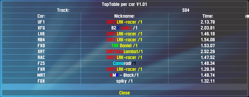 In the past I made the toptable script, which displays the best time for each car on that track (see screenshot below). Would that be useful as a start for this wish: Time table for best laps done total, car filter to click
