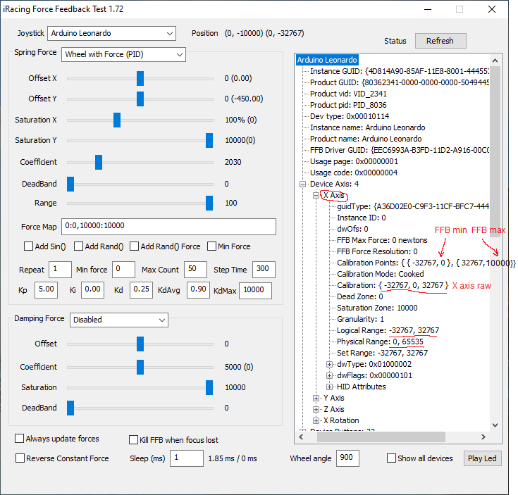 . I just did a fresh instal yesterday, version 0.6V. Tried FF steps 10000 and FF rate to 100Hz, turn off deadzone off and on - makes no difference.. Turning right its a strong spring, turning left even a bit spins the wheel strongly to left and keeps smashing into bump stop.