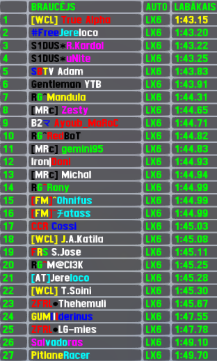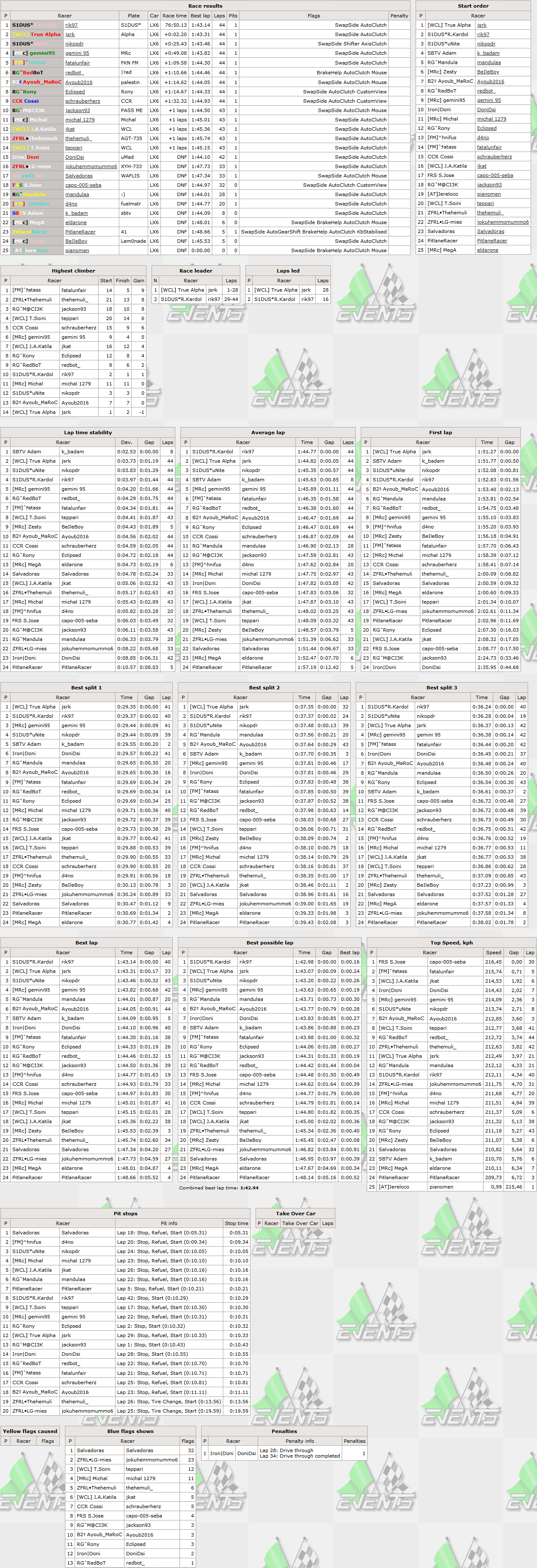 The combo selector did not join the track,but was sitting comfy in the virtual commentary booth,so the winning of the race was left to others - and that was not just some "best of the rest guy",as R.Kardol scored already his 3rd racewin of the year and 5th overall. It was not also a simple run away in lead win,as the dutchman qualified just 3rd and dropped down even to 4th early in race,but regained positions soon and took over the lead of the race when polesitter headed to pitlane for his mandatory pitstop. R.Kardol led the final 16 laps of the race,returning from pitlane ahead of his main rival,scoring his 3rd fastest lap of the race while increasing his lead - 20th top5 finish in his account. Mr Alpha,first name True,scored his 4th pole position in qualifying,tying for 2nd most on this chart. He led first 28 laps of the race,but lacked the pace to regain the lead after pitstops shuffling and had to settle for 2nd place finish,which is his 7th top5 finish,but he still clocked the 7th closest finish in RTFR XL history. Despite qualifying just 0.1s behind polesitter,Unite did not had the overall pace during the race to even consider challenging for the win - 3rd place finish is his 8th top5 finish here. Gemini joined RTFR XL just for 3rd time and despite having personal worst qualifying result he finished in best position ever - 4th,improvement by 2 positions. After 2 DNFs in row,Fatass finished his 4th RTFR XL race,improving the only previous finish by 15 positions - 5th place finish for him and 4th top5 finish for Finland in this race alone.