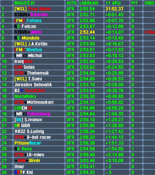 The only driver missing on grid was the fastest driver of qualifying - mr.Randomname scored his 4th pole position and left the server before race start. So the chances for glory were left to others and the one using them best was True Alpha,who started from 4th position,climbed to lead of the race during 7 laps and led the last 5 to finish 1st,becoming 20th driver in RTFR history to score 5th racewin in this event series. Besides win,mr.Alpha scored also his 11th top5 finish. Despite leading first 6 laps,R.Kardol had to give up lead to charging finn and settle for chasing position - 2nd place finish and 45th top5 finish. 3rd is the driver who got promoted to 1st starting position on the grid - Fatass lost lead very early and could not challenge for racewin,still 3rd place finish is his best result in RTFR,2 positions higher than his only previous top5 finish. Falcon is the highest climber between top5 finishers with his 4th place,that's 38th top5 finish for the canadian. Despite his misbehaviour penalty,it's still a top5 finish for Unite as he's classified 5th - his 44th achievement.