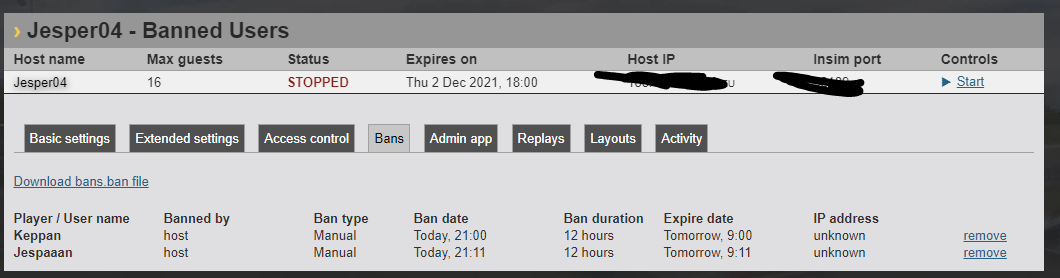 hello me and my friends are hosting a server and i banned one of them and then accidentally banned myself but i can't unban us, i press remove and nothing is working? can someone please tell my what to do?