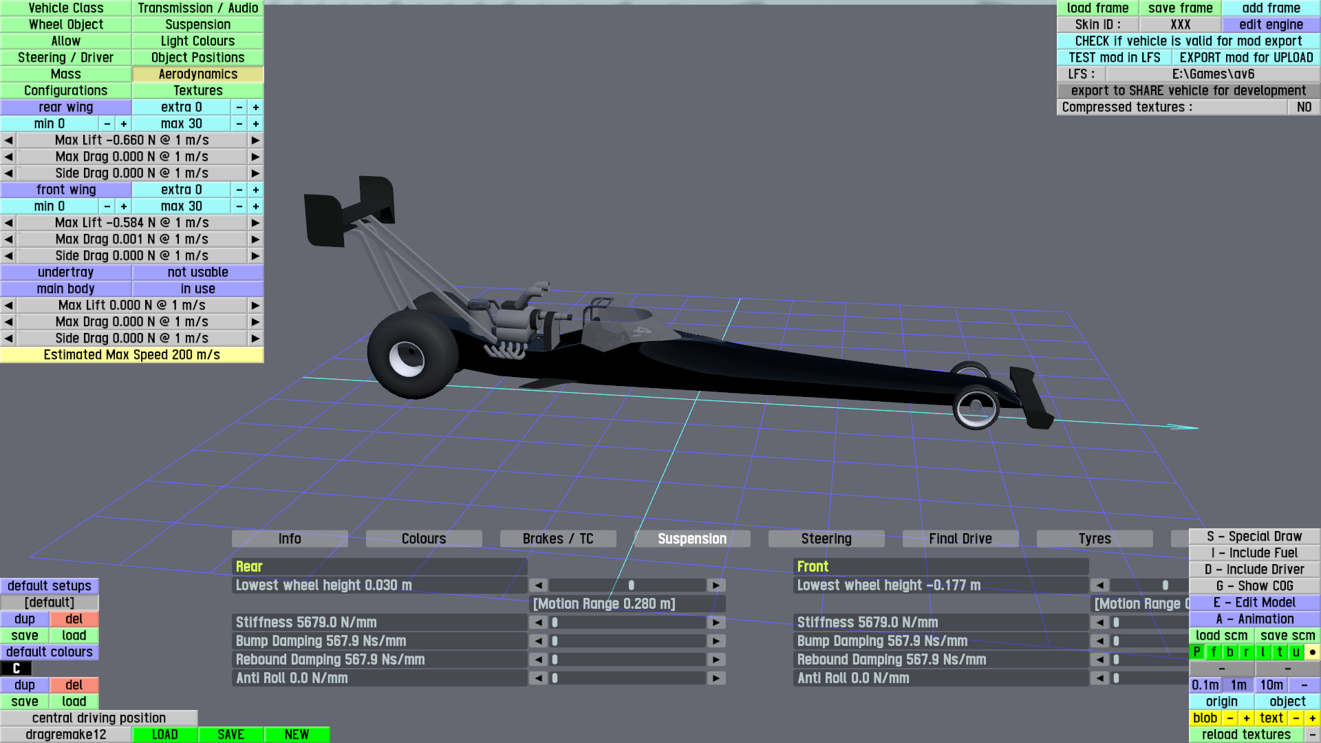 So for my dragster, I have been tinkering with many settings to get this rocketship to go even faster but I noticed a problem when changing the drag settings of the aero when for example I removed all the drag from the body and wings (leaving 0.001 lowest drag value possible), I noticed that the lower values for the suspension had been drastically increased, stiffness, antiroll etc all well above whats actually needed, it's very strange and I'm sure it's not intentional.