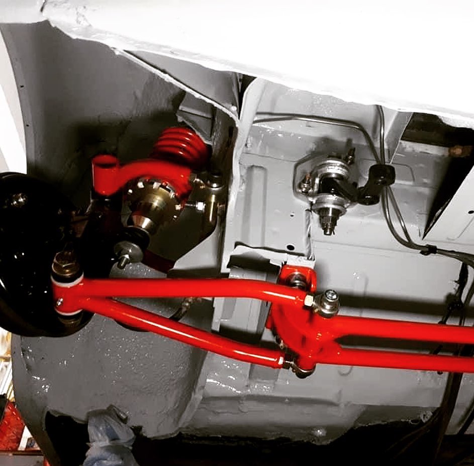 This front double wishbone suspension is taller on the inner points than the outer points, so when the suspension is compressed, it gets more positive camber. It's the opposite of what double wishbone suspension should do. When double wishbone suspension is compressed, camber should become more negative. The effect is to keep the wheel more vertical when the car leans.
