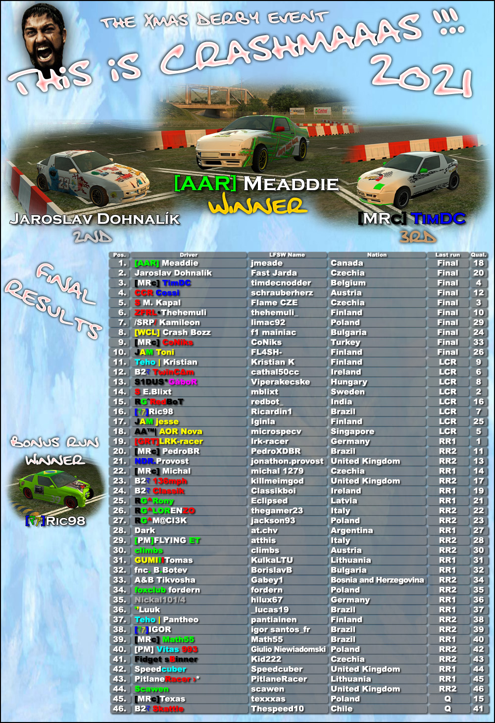 As always the official part of the event ends with finish of Bonus run,but the afterparty will continue as long there are crashhappy drivers in server - 10 lap races on the Bonus run track just for fun,where we will allow all cars (including mods),so this year the afterparty might be even more interesting than previously!