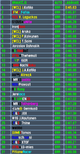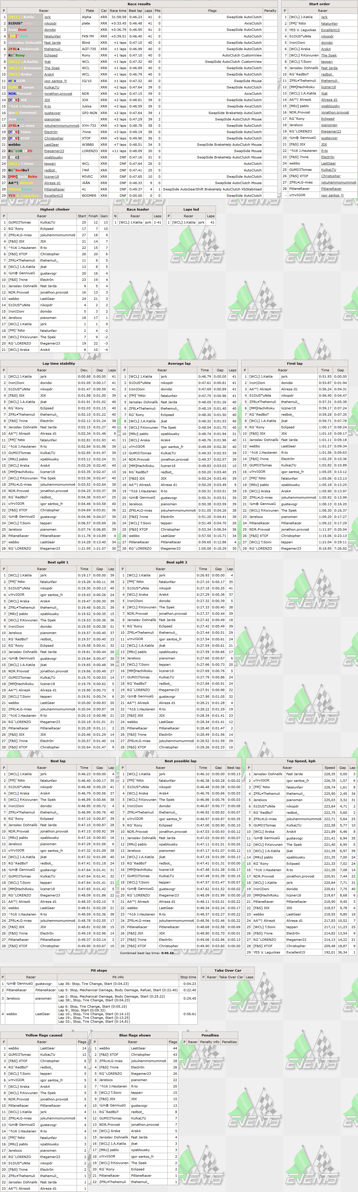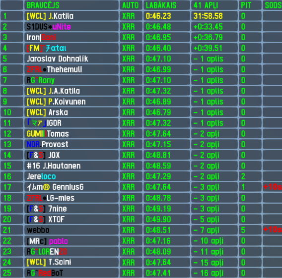 Season long leader in both RTFR standings did not join for this one,leaving the victory lane up for grabs for everyone else,even if it's questionable if he could be a factor in race for win - J.Katila is known as someone who can be very fast with XRR and he had no real competition today. The finn extended the 7-or-more-wins club to 10 members and also scored his 6th pole position,5th fastest lap of the race and 13th top5 finish. Unite finished 2nd with more than half minute gap (14th biggest margin of victory) and scored his 51st top5 finish. Another finn Doni finished 3rd,repeating his best result once again,9th top5 for him,followed by 4th and last finn in top5 - Fatal,who scored his 4th top5 finish. Best of non-finns and the last driver in top5 was J.Dohnalík,who finished the race already with 1 lap deficite - it's the 2nd time the czech driver scored a top5 finish.