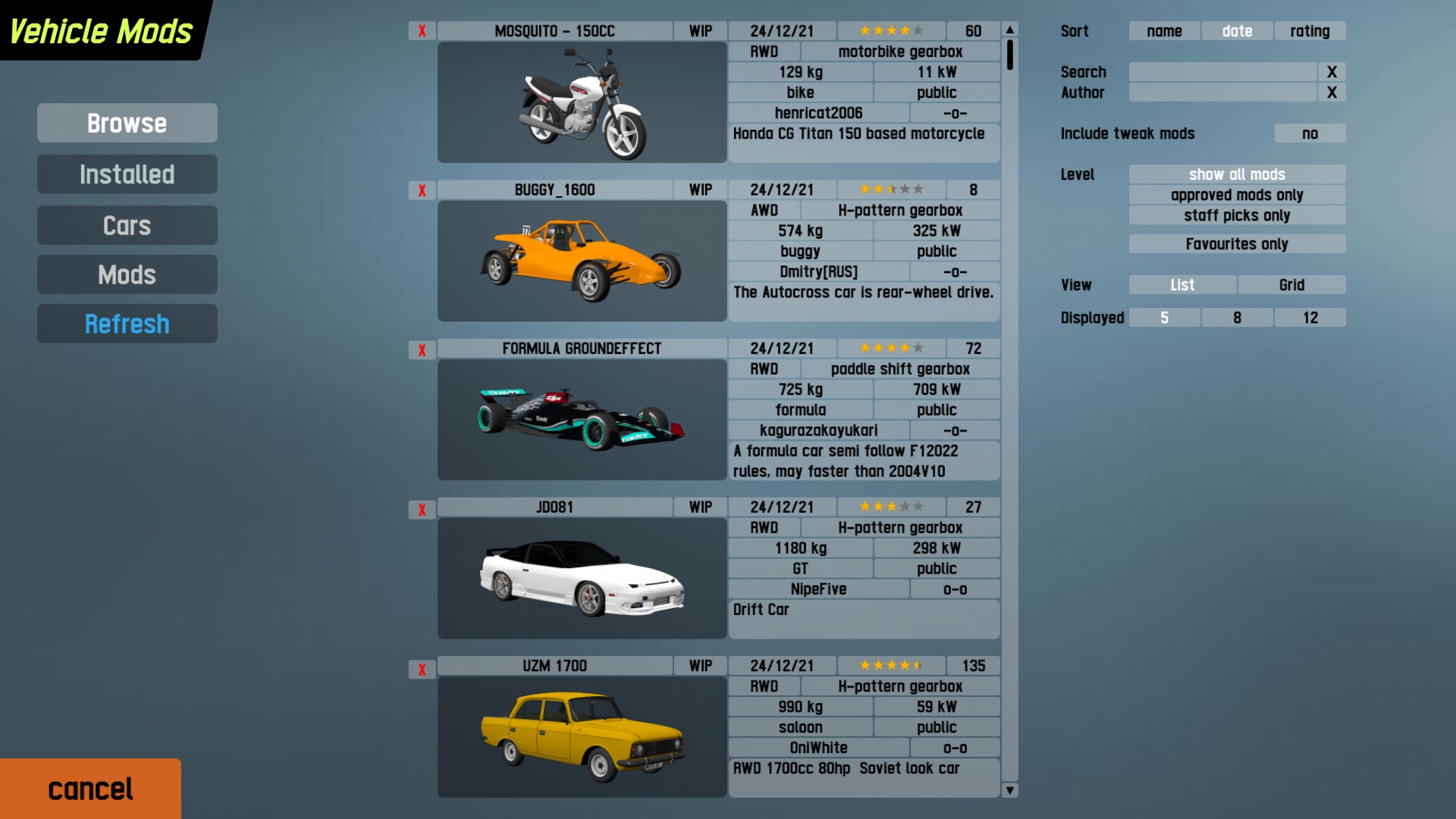 @Scawen : in the "installed mods" menu, it is a bit difficult to find out a particular mod => would it be possible to have the same kind of menu like the "browse" menu ? or at least having a thumb in front to diagnose quickly what kind of vehicle it is about ?