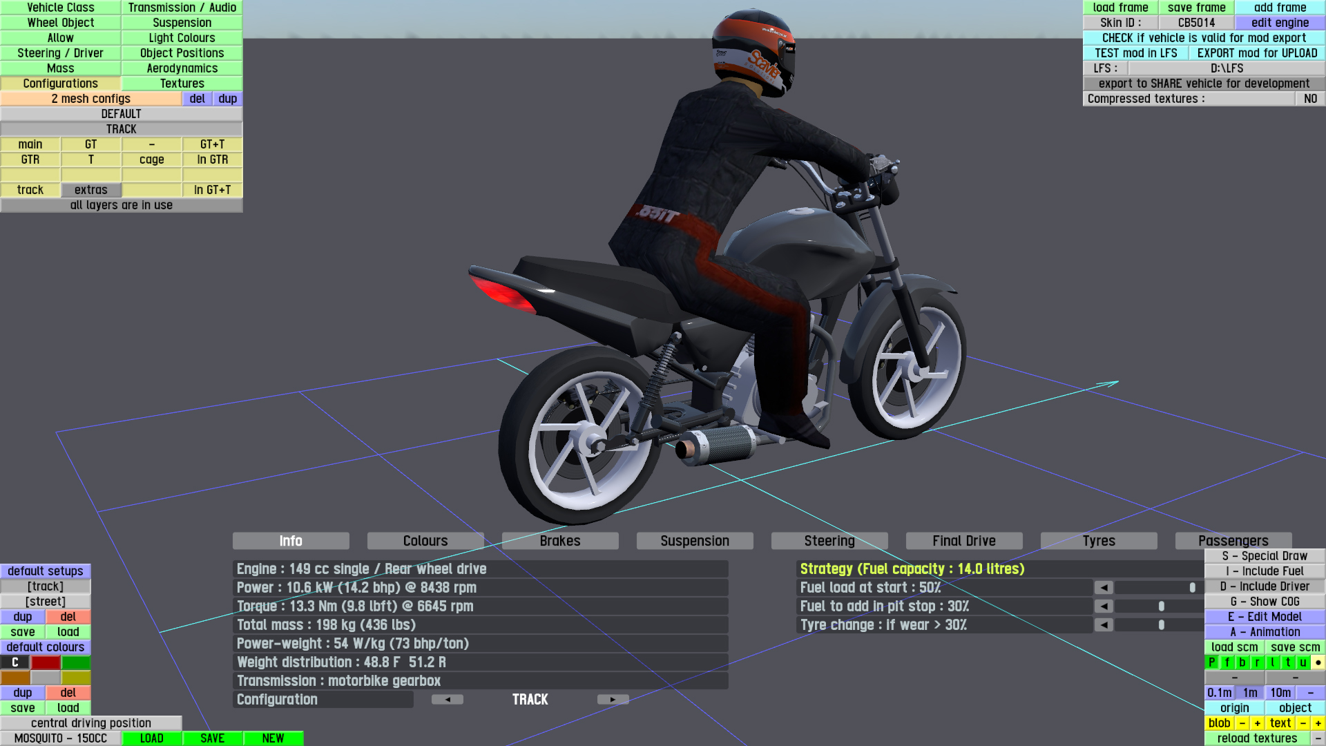And on the new track config, we could have an diffrent exhaust and remove the dashboard aswell, and the mirrors, which is kinda easy, i try to edit it once, i was able to remove both mirrors, looks good.