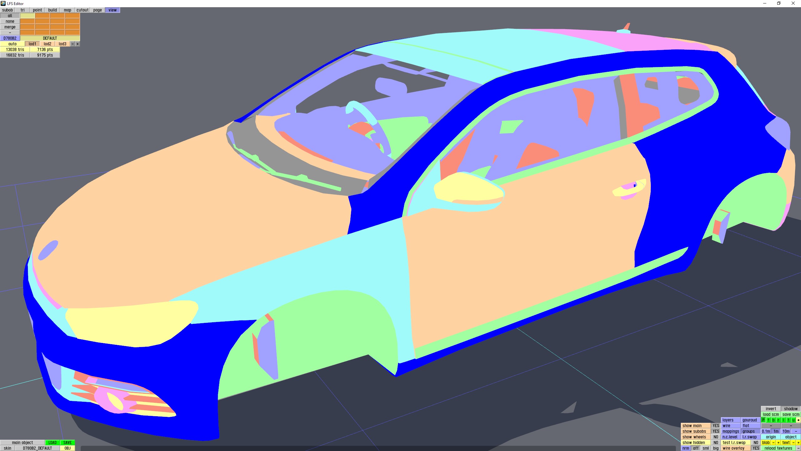 Fast forward to 2022 - vehicle mods are now officially supported. Despite a catastrophic failure of my harddrive in 2021, I was able to find the mod on my old decommissioned HDD and I've started the resurrection of the project. This time with the proper tools I was able to create a 1:1 copy of the car you can see in the LFS Skin Viewer. I had to redo all the mappings (250+):