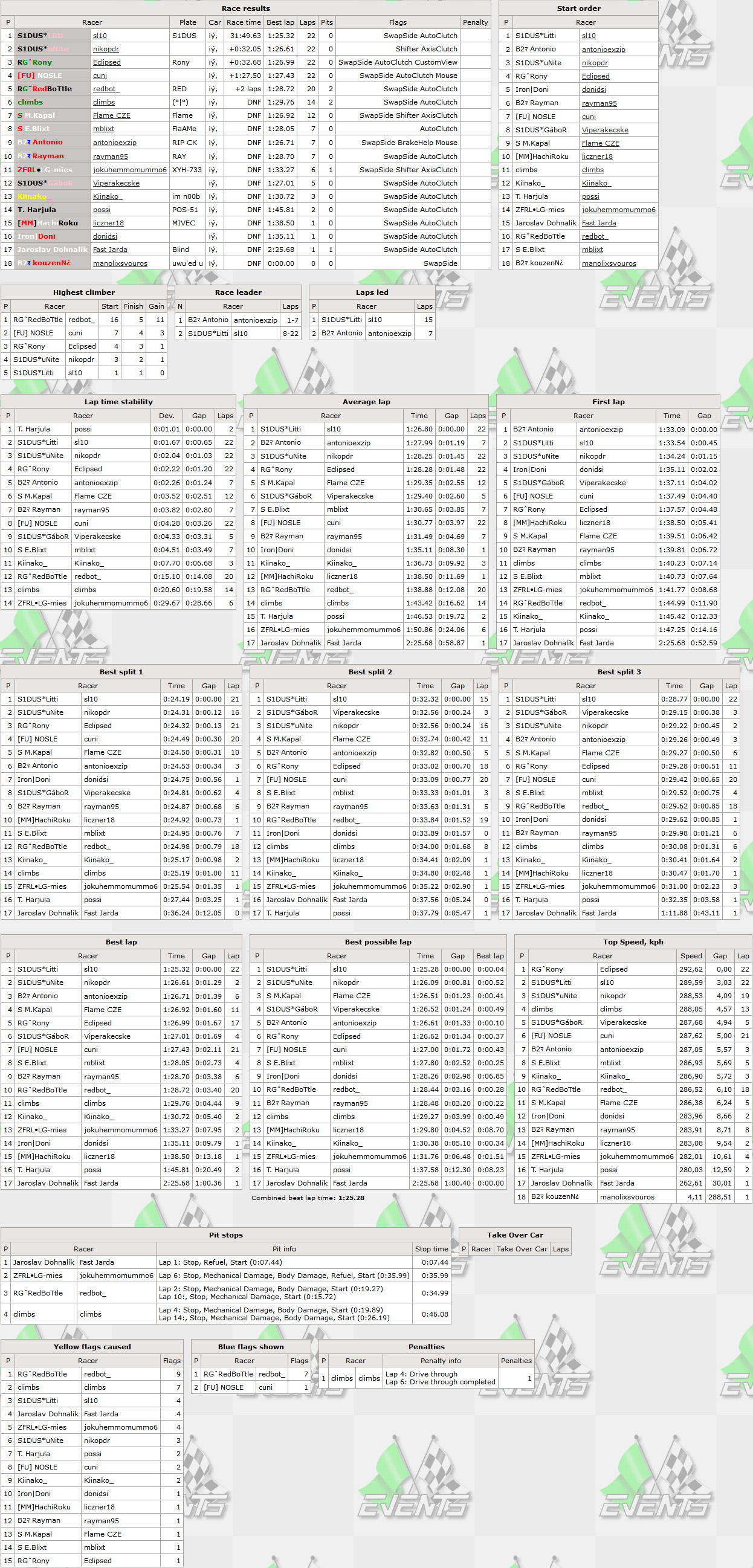 THis race brought in the victory lane another driver,who still hasn't seen it in standard RTFR versions - Fragmaster Fatal from front row and during 1st half of the race found way past all 3 drivers starting ahead of him to lead the 2nd half of the race,on the final lap setting the race's only sub-1:24 laptime. R.Kardol advanced even more positions - starting 7th,he found way pass a total of 5 drivers to finish 2nd. Last on the podium was a driver with even better progress - Upsas finished 3rd with +13 positions gain.