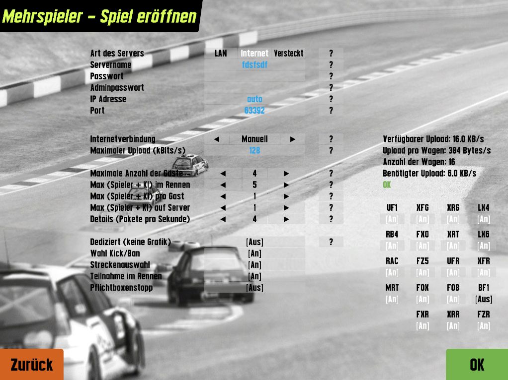 in LFS please go to Multiplayer -> Create new game . Then you'll see a screen, which is similar to the one I have posted here. If there are passwords in the mask, please remove them.