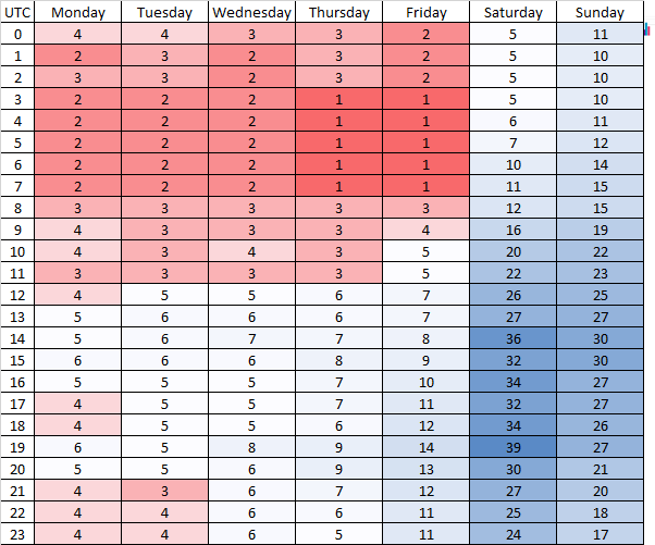 The participants spread across many timezones, and this is very visible in the data. The most popular time slot seems to be in the UTC afternoon on Saturday with roughly 40% availability, only slightly worse the afternoon on Sunday with 33%. 25% state they would compete in a race Saturday or Sunday evening. Those slots often prove to be difficult to fill efficiently as real life events (racing and otherwise) also take place there but it seems also to be the slot with the most potential.