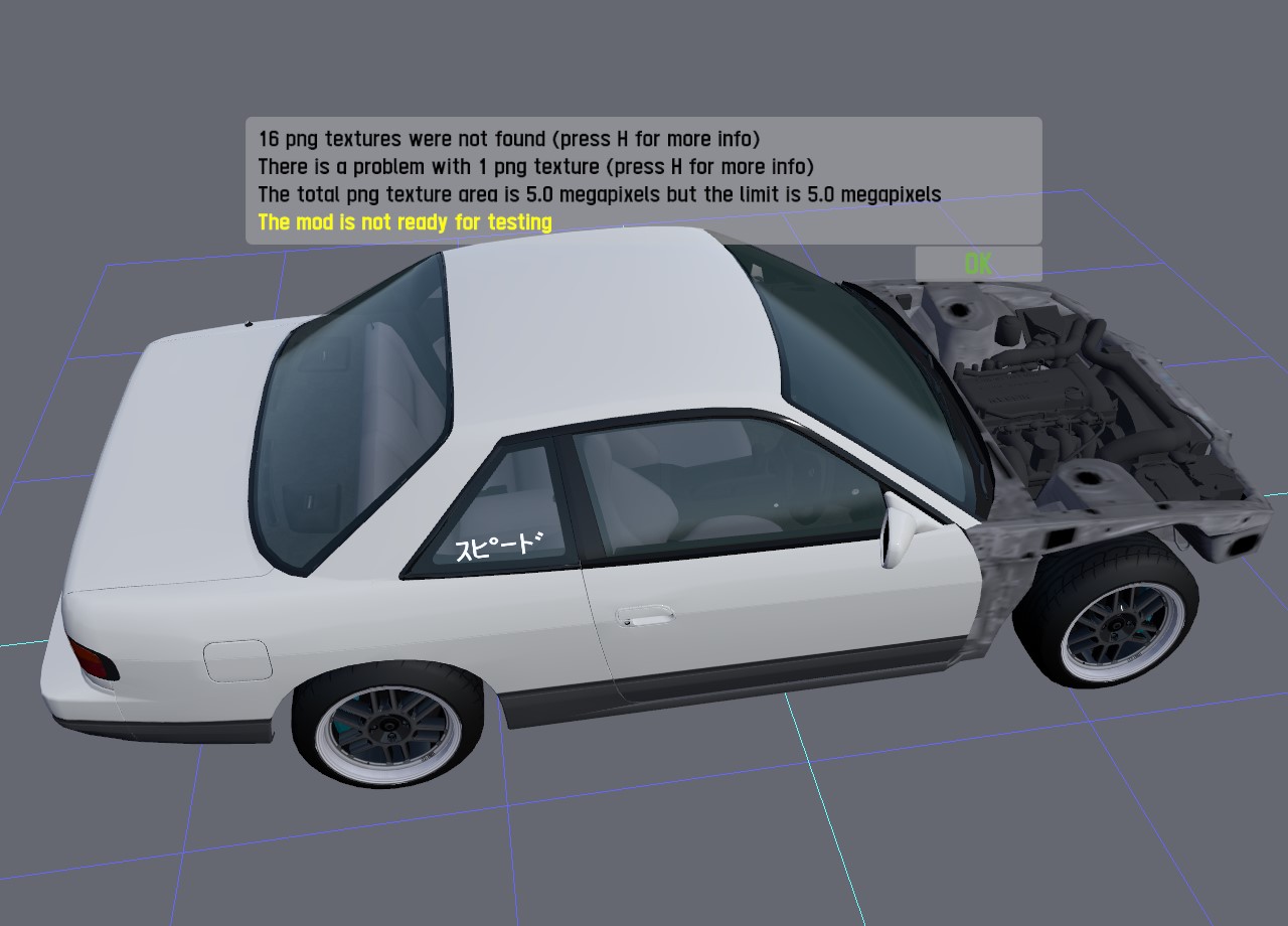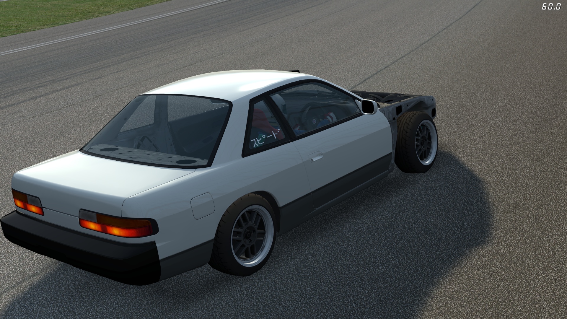 Thnak you for kind words. Been doing it for a long time. Technically from 2004 (started as SLRR mod).I think LFS deserves best yet optimised models, that's what i do. The irony that full chassis appeared because of LFS poly limit for body and I could not fill the door gaps because of limit, so i made a full chassis based on my old SLRR model, imported it to another sub-object, where polycount wasn't exceeded. Thus i recieved non transparent gaps + interesting damage model as a bonus. I'm building it on 0.6U, and it has no issues there. But 0.6W54 LFS says there is "too many triangles". I know the problem is because of street version's aero kit. Same stock model has no error, using same chassis model. I did not get my hands on LFS car editor yet. First of all I will finish it as an unofficial mod (I have used to some modelling/mapping techniques) with all parts well made and then i plan to rescale it with CAD to real S13 points and then upload it with all official mod requirements. It's gonna take time, i hope less than another 15 years))))