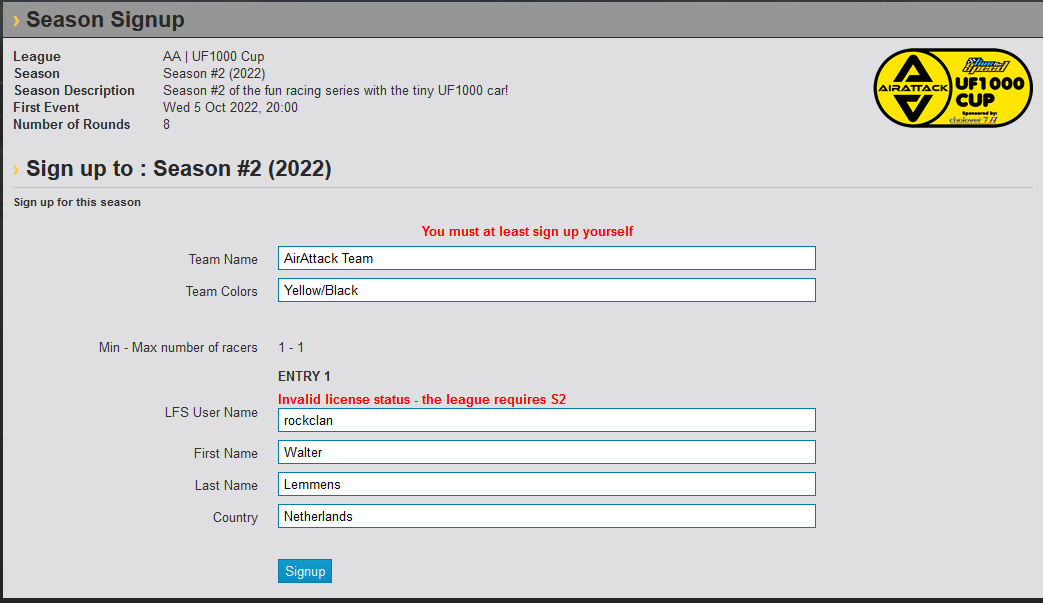Whilst planning ahead for the UF1000 Cup's 2nd season, I decided to opt for the on-site signup system from the leagues section, however, it appears to not work and to be having more than 1 issue.