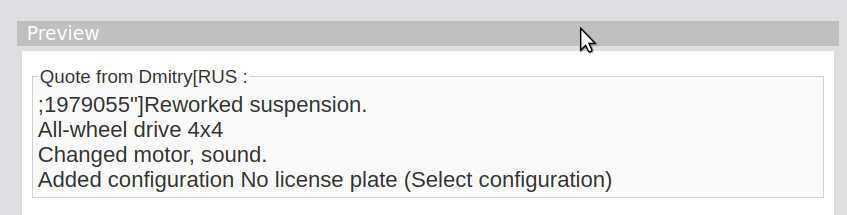 clicking "quote" on posts by user https://www.lfs.net/profile/246262 breaks formating like this: Quote from Dmitry[RUS :;1979055"]Reworked suspension. All-wheel drive 4x4 Changed motor, sound. Added configuration No license plate (Select configuration) I guess it could be the [ ] Attached images
