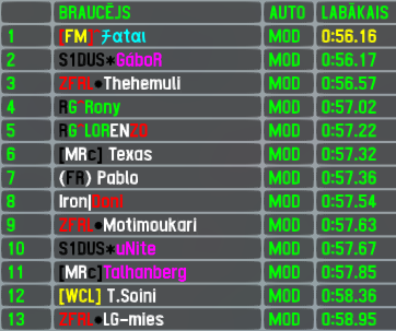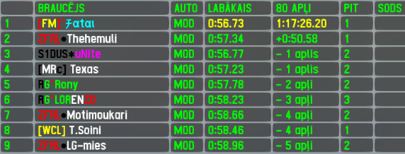 With one of the drivers retiring,defending teams champions S1dus now have lost most of their lead and now are just a single point ahead of team of current drivers standings leader - Fragmasters. Zafiralis scored most points in this round and moved up to 3rd position,currently 6 points behind leaders. Nations cup is effectivelly over - Finland has already 56 points gap over closest followers,which is estimated more than any other nation will score in whole season - most of the other nations has only 1 points scorer. The competition is only for 2nd position in this table,currently posessed by Latvia,but competition is tight as positions 2-5 are seperated by a single point between each other.