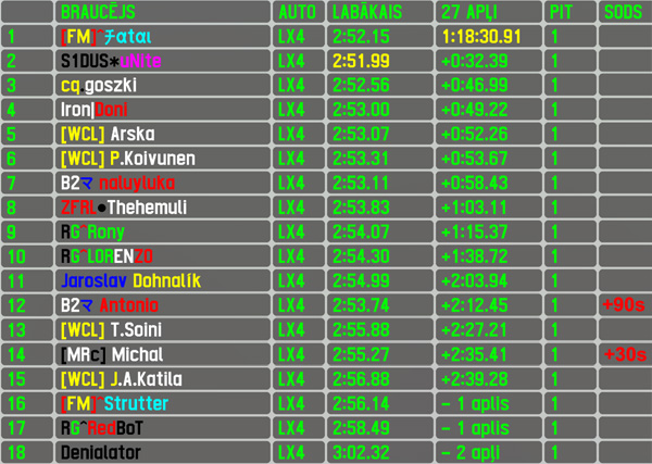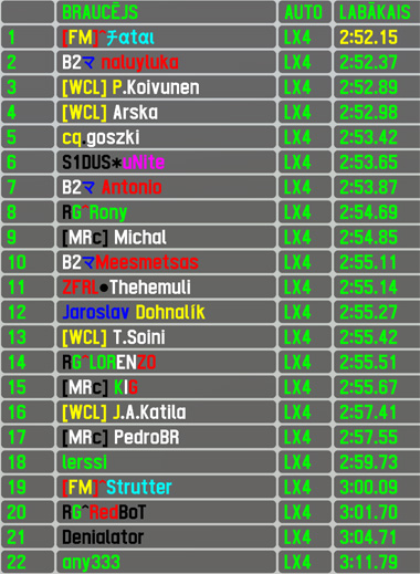 Since his fellow front row starter got himself in a 1st turn incident,polesitter Fatal was able to run away from competition right from 1st turns (kinda repeat of monday's VERL race situation),so the finn led every single meter and joined the RTFR XL winners club as it's 28th member. The pole position was Fatal's 2nd such achievement,but also 30th for Finland,the top5 finish was his 9th. With over half a minute gap,2nd in finish was Unite,who set the fastest lap of the race,his 4th,adding 18th top5 finish in his stats. Goszki set a new best result in qualifying - 5th position is an improvement of one position compared to his only previous attempt,but the race brought a repeat of his only previous result - 3rd. Doni joined late and missed qualifying,but seems like he was well prepared as climbed up to 4th position in race results,repeating best finishing result from 3 top5 finishes. Top5 was closed by Arska,who scored his 8th top5 finish.