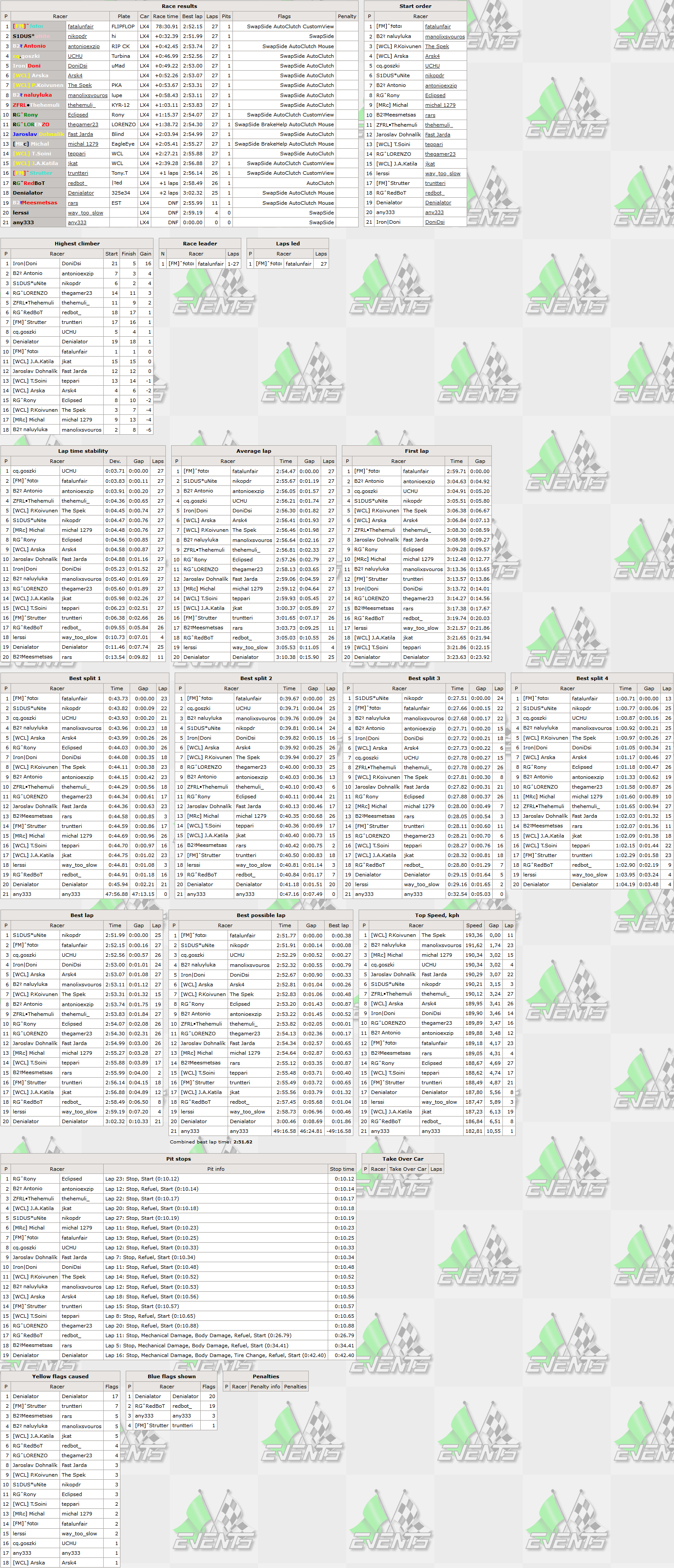 B2マ Antonio - receives 60 seconds penalty added to his finish time for intentional contact (PIT manouvre) on final lap against cq.goszki. Future misconducts of such art will lead to disqualification or even race ban.