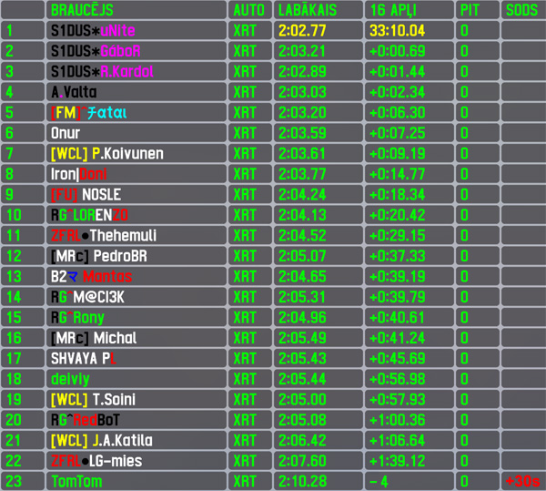 Current 10-race rating leader Unite started from 5th position and climbed up to 3rd during first 7 laps until 2 leaders had a physical dispute at end of lap 7. The finn found a way past the 2 slowed down cars and led the remaining laps to cross finish line first to enter the 2nd decade of race wins,passing Fast for 7th most wins in RTFR,early in the race he also set the fastest lap of the race,which is his 24th,also adding 65th top5 finish to his stats - one less than all time 2nd most of Botsi. Also Gábor profited from same incident between 2 early leaders to improve positions,however he had to race hard to keep the 2nd position in last few laps - the success earned him the 32nd top5 finish. R.Kardol was the one to try the pass for lead at the end of lap 7,but the 2 cars aiming for same piece of tarmac caused multiple position loss instead of lead gain,so the dutchman could salvage 3rd position with some luck - 63rd top 5 finish for him and full podium lock up for the team for 2nd race in row. A.Valta was the only driver to beat 2:02 mark in qualifying,scoring his 7th pole position in RTFR,but after the mentioned incident he lost his lead and after some battles he had to concede to 4th position in finish,which is his 11th top5 finish. Despite qualifying 3rd,Fatal never was a competitor for win,lost 2 positions to finish 5th,that's his 17th top5 finish.