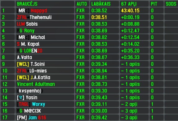 The series leader A.Valta wasn't too relevant in fight for win this round as he finished 8th in the race,but still keeps standings lead after half of the season,but his lead has been decreased to 6 points. Thehemuli is still 2nd - this round brought him closer to leader and further from his main rival for 2nd place - Lorenzo is still 3rd,but now already 10 points away from 2nd place. This round was also part of the fight for the Oval Trophy - Happyd leads this competition by 2 points over Thehemuli and 5 points over Sobis. The 2nd and deciding round for this award is the round 7 in Rockingham Oval using a slower car.