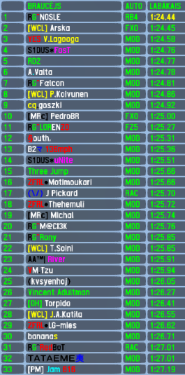 The inaugural officially scored RandomCar race gathered up 33 drivers in the qualifying,featuring 15 different cars,however 5 did not take the earned position on grid,which caused loss of another different car.