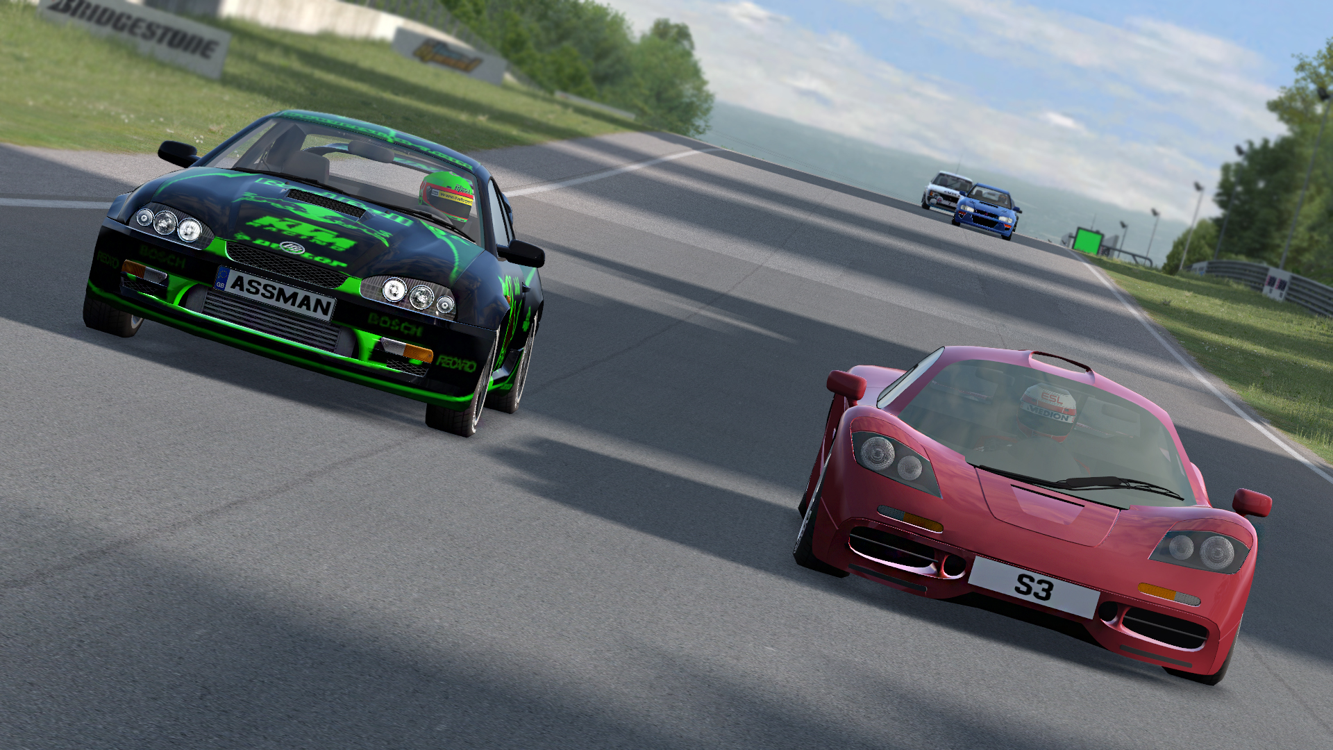 bananas was behind me with significantly more speed so I drove the rightmost side of track to prevent him getting inside line on t1, but he decided to cut through grass to overtake me and have the inside line to t1