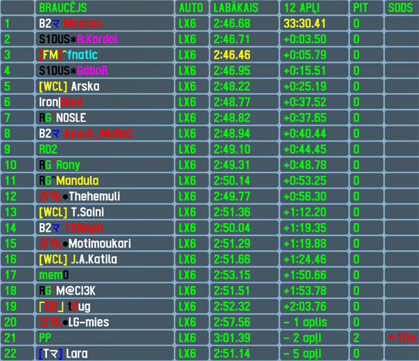 Late in qualifying with his last attempt Mantas secured himself a front row start for the race,missing pole position by 0.04s. That was still 1 position better than his previous best result in qualifying,but with this his best RTFR event did not stop - after chasing hard for 4 laps,the lithuanian found a way past polesitter and took over the lead for the first time in this event series to lead last 8 laps. With this Mantas became the 78th driver to score a race win in RTFR,first since november of last year. The win was 3 positions better finishing result than previous best and 7th top5 finish. R.Kardol was the fastest in qualifying to score his 14th pole position,but race pace was not good enough to convert it into another win - the 2nd place finish is his 76th top5 finish. Fnatic qualified just 7th,but during the race found a lot of pace improvement to climb up to 3rd,which is 2 positions better than his only other top5 finish,during the race he also set the fastest lap of the race - that's his first such achievement in RTFR. Current rating and standings leader Gábor finished just 4th,losing some valuable points to his main rival,but his 46th top5 finish actually should be enough to not worry about losing lead in the final round of 2023 season 1. Top5 was closed by Arska,who scored his 19th top5 finish,1st this year.